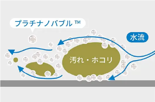 お風呂や洗面所、キッチン、トイレ、排水口などに付いた汚れや気になるニオイの原因となるバイオフィルム。1μm未満という極小のプラチナノバブル™が、このバイオフィルムの隙間に入り込んで汚れを浮かせ、きれいに流し去ります。