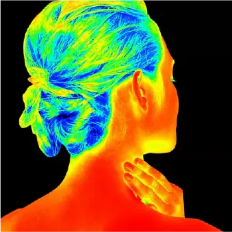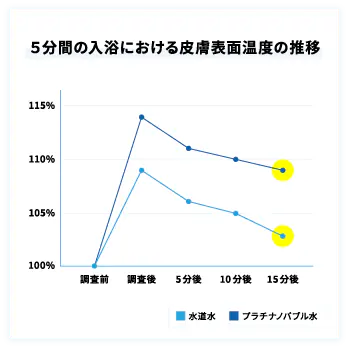 【測定条件】室温20℃の部屋で約20分順化。浴槽をお湯でいっぱいにして、5分間入浴。入浴前、入浴後、5分後、10分後、15分後の皮膚表面温度を測定。