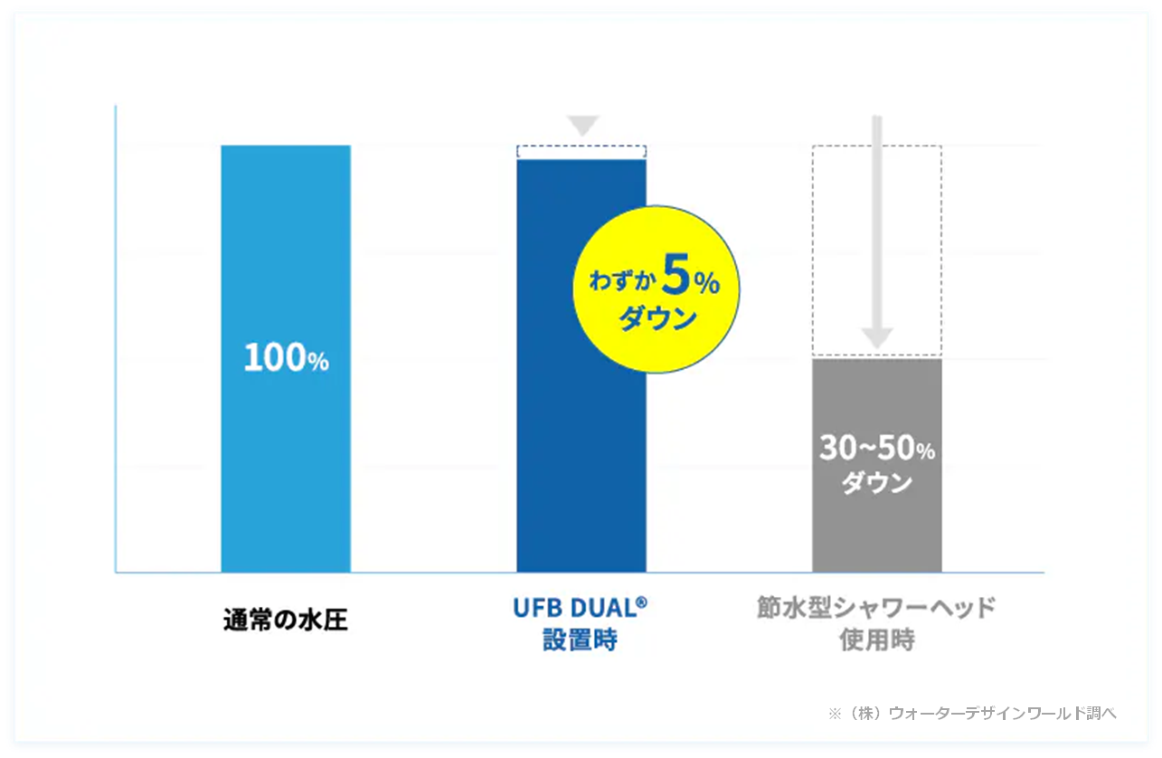 一般的な節水シャワーヘッドやナノバブル発生器は、水圧が30%~50%も低下してしまいますが、UFB DUAL PLUSは特許技術のDUAL構造により、水圧・水量の低下をわずか5%以内に抑えています。そのため、シャワーはもちろん、キッチンや洗面所など、お家のどこでも快適な水圧で水をお使いいただけます。